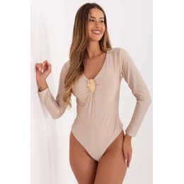 Toto elegantné body štandardnej dĺžky, vyrobené prevažne zo zmesi viskózy a polyesteru, poskytuje pohodlie a ideálne padne. Model má hladkú štruktúru materiálu s jemným, dominantným vzorom, ktorý zdôrazňuje jeho jedinečný charakter. Dlhé rukávy dodávajú celku eleganciu a srdiečkový výstrih zdobí kovová aplikácia a jemné záhyby, ktoré mu dodávajú sofistikovaný akcent. Body sa zapína na praktické háčiky, vďaka čomu je nielen štýlové, ale aj funkčné.