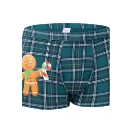 Pánske vianočné boxerky s veselou potlačou na stehne. Pozadie boxeriek tvorí slávnostná zelená a tmavomodrá kocka. Potlač na nohe je veľmi obľúbený perník. Tieto boxerky sú zaujímavým radom jedinečnej pánskej spodnej bielizne pre tých, ktorí majú zmysel pre štýl a sú sebavedomí. Pohodlné boxerky vďačia za svoje vlastnosti elastickému materiálu a tiež precíznemu spracovaniu. Ploché švy sú šetrné k pokožke, beztlaková úprava nohavíc zaisťuje maximálne pohodlie a podporný pás je podšitý mäkkým materiálom šetrným k pokožke. Boxerky sú zabalené v estetickej škatuli.