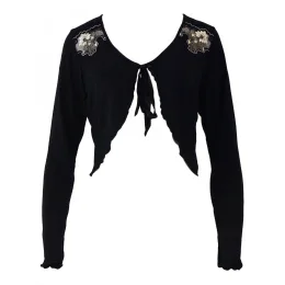 Krátke bolerko s vlnitými okrajmi, dlhými rukávmi, zapínanie na saténovú stuhu, zdobené priehľadnou čipkou na ramenách.