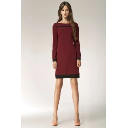 Vysněné šaty všech milovníků retro stylu! Dlouhý rukáv se bude hodit i v chladnějších dnech. Rovně střižený výstřih zdobený tmavou vsadkou zvýrazňuje linii ramen. Jemně rozšířený spodní okraj dodá siluetě lehkost. Vínová barva v kombinaci s černým lemováním vypadá mimořádně sytě.