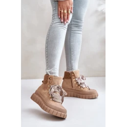 Dámske čižmy vyrobené z ekologického semišu. Stoja na platforme, ktorá dokonale izoluje od studenej zeme. Tento model má šnurovanie a dodatočné zapínanie na zips. Zateplené sú dekou na čižmách, ktorá poskytuje pohodlie a teplo pri nosení. Na zvršku je ovčia koža. Ide o obuv, ktorá je nielen štýlová, ale aj funkčná. Ideálna pre ženy, ktoré ocenia pohodlie a módny vzhľad.