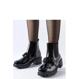 Elegantné topánky v čiernej farbe, vyrobené z lakovanej kože a zdobené kovovou sponou. Sú ideálne pre chladné jesenné a zimné dni, pretože majú hrejivý vnútro. Pohodlné zapínanie na zips uľahčuje obúvanie aj vyzúvanie topánok. Pevná gumová podrážka zabezpečuje dobrú priľnavosť na rôznych povrchoch. Topánky z kolekcie jeseň/zima, ktoré budú skvelým doplnkom mnohých outfitov.