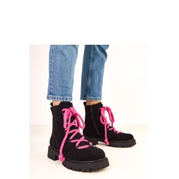 Elegantné členkové čižmy z kvalitnej ekokože, ktoré spájajú módny vzhľad s pohodlím pri nosení. Model má vpredu šnurovanie a na bokoch praktický zips, ktorý uľahčuje obúvanie a prispôsobenie topánok nohe. Čižmy majú okrúhlu špičku a stabilný podpätok s dĺžkou 4 cm, ktorý poskytuje pohodlie počas celého dňa. Polstrovaná vnútorná časť a mäkká textilná stielka zaručujú teplo počas chladnejších dní. Strih s výškou 15 cm jemne zvýrazňuje členok, čím dodáva štýlu charakter a eleganciu. Je to skvelá voľba na každý deň, ku nohaviciam aj šatám.