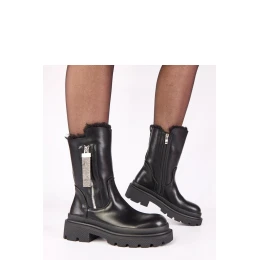 Elegantné členkové čižmy vyrobené z kvalitnej ekokože, ktoré kombinujú klasický strih s efektnými detailmi. Model má ozdobný vonkajší zips so zirkónmi, ktorý dodáva čižmám eleganciu a jemný lesk. Čižmy majú okrúhlu špičku a stabilnú platformu s výškou 5 cm, ktorá poskytuje pohodlie pri chôdzi a jemné zvýraznenie postavy. 20 cm vysoký zvršok dobre sedí na nohe, poskytuje pohodlie a ochranu počas chladných dní. Vnútorná časť čižiem je vyrobená z termo textílie, ktorá zaručuje teplo a pohodlie pri nosení. Dodatočný zips umožňuje rýchle obúvanie a vyzúvanie čižiem. Ide o klasické členkové čižmy s elegantným akcentom, ideálne na každodenné jesenné a zimné štylizácie.