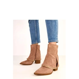 Štýlové členkové čižmy s obráteným golierom, ktoré spájajú eleganciu s moderným detailom. Sú vyrobené z kvalitnej semišovej ekokože, vyzerajú efektne a sú ideálnou voľbou na chladnejšie dni. Model má špicatý nos, ktorý opticky zjemňuje chodidlo, a 9 cm vysoký stĺpik poskytuje stabilitu a pohodlie pri chôdzi. Obrátený golier dodáva čižmám charakter a módny akcent a zips uľahčuje rýchle obúvanie. Vďaka zatepleniu a textilnej stielke čižmy zaručujú teplo a pohodlie počas celého dňa. 13 cm vysoký golier krásne obopína členok a vytvára moderný a elegantný vzhľad.