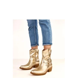Elegantné čižmy v zlatej farbe vyrobené z kvalitnej ekokože, ktoré očaria svojím štýlovým a ženským charakterom. Model zdobí pracka, ktorá dodáva eleganciu, a štíhly špicatý nos, ktorý zdôrazňuje elegantný tvar chodidla. Čižmy majú stabilný podpätok v tvare stĺpika s výškou 5 cm, ktorý zaručuje pohodlie a istotu pri chôdzi. Zapínanie na zips uľahčuje obúvanie a výška rozkroku 16 cm sa dokonale hodí k jesennému a zimnému oblečeniu. Vnútro je vyrobené z mäkkej tkaniny bez podšívky, čo z neho robí ideálny model na prechodné obdobie. Sú to výnimočné čižmy pre ženy, ktoré ocenia eleganciu, lesk a módne detaily.