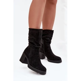 Dámske čižmy vyrobené z ekologického semišu. Model zdobí vrúbkovaný zvršok, ktorý dodáva módny charakter. Vložený strih s dodatočným zipsom zaisťuje pohodlie pri obúvaní. Čižmy sú umiestnené na stabilnom stĺpikovom podpätku, ktorý zaisťuje pohodlie pri chôdzi a jemne zoštíhľuje postavu. Vnútro je vystužené látkou s penovým povrchom, ktorá zaisťuje teplo nôh počas chladnejších dní. Ide o skvelú voľbu na jesennú a zimnú sezónu, univerzálne čižmy, ktoré sa hodia na každodenné nosenie aj na elegantný štýl.