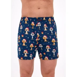 - pánske voľné boxerky v tmavomodrej farbe zdobené hravou potlačou sviatočných psov so santovskými čiapkami a cukrovými lízankami
