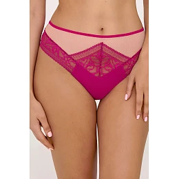 Bikiny AV 2220 Fuchsia sú špeciálnou ponukou pre ženy, ktoré ocenia zmyselnú spodnú bielizeň vo výraznej farbe. Intenzívny odtieň fuksiovej dokonale zvýrazňuje postavu modelu a prednú časť nohavičiek zdobí kombinácia priehľadného tylu a pôsobivej geometrickej čipky, ktorá opticky zoštíhľuje siluetu.