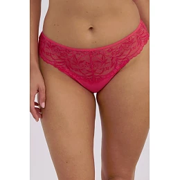 Brazilka Blanca Art. 1363 je výjimečně smyslný model, který kombinuje jemnost krajky s pohodlím každodenního nošení. Je vyrobena v intenzivním růžovém odstínu a krásně zvýrazňuje siluetu. Přední díl zdobí široký pás z jemné krajky s bohatým květinovým vzorem, který dodává eleganci a ženský půvab. Zadní díl - charakteristický pro brazilský střih - je z velké části tvořen složitě zdobenou krajkou, která mírně odhaluje hýždě a opticky je zaobluje.