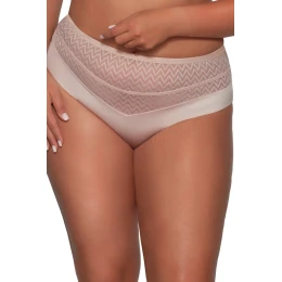 Wysokie figi brazyliany Ava, które łączą elegancję z codziennym komfortem. Wykonane z gładkiego, przyjemnego w dotyku materiału, zapewniają idealne dopasowanie i modelowanie sylwetki. Górna część fig ozdobiona jest delikatnym, półprzezroczystym tiulem w modny, geometryczny wzór w jodełkę, co nadaje całości nowoczesnego charakteru. Doskonałe zarówno pod dopasowane ubrania, jak i na co dzień, kiedy liczy się wygoda i styl.