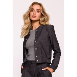 Štýlová dámska bunda typu bomber vyrobená z kvalitnej bavlnenej tkaniny. Zapínanie na praktické gombíky zaručuje jednoduché obliekanie a vyzliekanie. Bunda má elastický lem a rukávy, čo zaručuje dokonalé prispôsobenie a pohodlie pri nosení. Rebrovaná léga dodáva bunde športový charakter a zároveň chráni pred vetrom. Vďaka absencii podšívky je ideálnym oblečením na mnoho ročných období. Navrhnutá a ušitá v Poľsku, spája moderný dizajn s funkčnosťou.