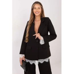 Elegantní dámský sako je skvělou volbou na návštěvy a stylové události, kde záleží na eleganci a efektních detailech. Jeho klasický tvar s límci je doplněn ozdobnými prvky, které celku dodávají jedinečný charakter. Model je vyroben z kombinace polyesteru a elastanu, díky čemuž materiál jemně pracuje, poskytuje pohodlí a zároveň vypadá elegantně a uklizeně. Sako má také podšívku, která zvyšuje pohodlí nošení a zaručuje vysokou kvalitu zpracování. Na ramenou jsou vsazeny polštářky, které jemně modelují siluetu a zdůrazňují formální, návštěvní charakter sak. Efektní aplikace s džety je dominujícím ozdobným prvkem, dodávajícím lesk a modernost. Sako má standardní délku a dlouhý rukáv zakončený krajkou dodává celku ženský a jemný výraz. Spodní část saka je také zdobena krajkou, co vytváří souvislý a elegantní efekt. Přední část se zapíná na knoflík, co zdůrazňuje klasický, ale zároveň lehký charakter modelu. Je t