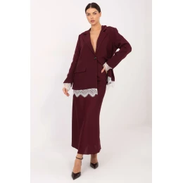 Elegantní dámský sako je skvělou volbou na slavnostní příležitosti a stylové akce, kde záleží na eleganci a efektních detailech. Jeho klasický tvar s límci je obohacen o dekorativní prvky, které dodávají celku jedinečný charakter. Model je vyroben z kombinace polyesteru a elastanu, díky čemuž materiál jemně pracuje, poskytuje pohodlí a zároveň vypadá elegantně a uklizeně. Sako má také podšívku, která zvyšuje pohodlí nošení a zaručuje vysokou kvalitu zpracování. Na ramenou jsou vsazeny polštářky, které jemně modelují postavu a zdůrazňují formální, slavnostní charakter saka. Sako má standardní délku a dlouhý rukáv s krajkou dodává celku ženský a jemný vzhled. Spodní část saka je také zdobena krajkou, což vytváří jednotný a elegantní efekt. Přední díl se zapíná na knoflík, což zdůrazňuje klasický, ale zároveň lehký charakter modelu. Je to stylový návrh pro ženy, které oceňují eleganci, ideální na slavnostní událost