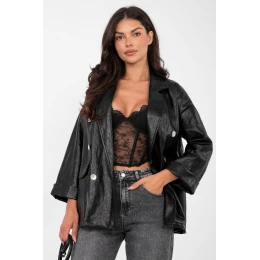 Moderní dámský kabát z ekokože je stylovým návrhem pro každodenní a kancelářské outfit. Vyrobený z vysoce kvalitního materiálu, který kombinuje viskózu a polyuretan, vypadá elegantně a zároveň je pohodlný na nošení. Model s standardní délkou má skládací límce, které zdůrazňují klasický střih. Dvojitý řadový závěr na knoflíky dodává kabátu výrazný, moderní charakter. Imitace kapes plní dekorativní funkci a zachovávají čistou, hladkou linii přední části. Kabát má dlouhé rukávy, není podšitý ani vyplněný, což ho činí ideálním pro vrstvené outfit v jarní / podzimní / zimní sezóně. Hladký vzor ho činí univerzálním a snadno kombinovatelným jak s materiálovými kalhotami, tak s džínami nebo šaty. Je to ideální volba pro ženy, které oceňují moderní styl, eleganci a nadčasový design.
