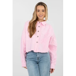 Elegantná dámska džínsová bunda v ležérnom štýle, ideálna na každý deň. Je vyrobená z kvalitnej bavlny, poskytuje pohodlie a všestranný charakter. Model s krátkou dĺžkou, klasickým golierom a dlhými rukávmi, zapínanie na gombíky. Spodná časť bundy je ukončená moderným ripsom, ktorý celku dodáva mierne rockový akcent. Originalitu jej dodávajú vyšívané kvety umiestnené na ľavej strane bundy na prednej strane, rukávoch a chrbte, ktoré vytvárajú efektný a ženský detail. Praktické vrecko na pravej strane na úrovni hrudníka zdôrazňuje úžitkový charakter modelu. Skvelá voľba na každodenný outfit, a to k šatám, džínsom aj sukni.