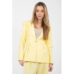 Elegantné dámske sako z kvalitnej viskózy a ekokože na báze polyuretánu, vytvorené s ohľadom na výstavný štýl. Hladký materiál zdôrazňuje moderný a nadčasový charakter modelu, zatiaľ čo štandardná dĺžka zaručuje klasické proporcie. Sako má plisované klopy a efektné kontúry na prednej strane, ktoré dodávajú siluete výraz a elegantný tvar. Zapína sa na gombík a je vybavené podšívkou, ktorá zaručuje pohodlie pri nosení a estetický strih. Vložené ramenné vypchávky jemne modelujú líniu ramien, čím celku dodávajú eleganciu a profesionálny vzhľad. Je ideálnou voľbou na formálne a výstavné komplety, a to tak s nohavicami, ako aj so sukňou alebo šatami.