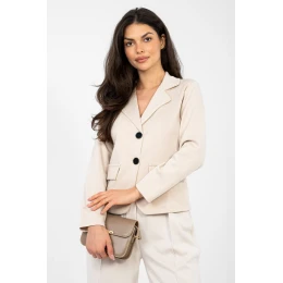 Elegantný dámsky blejzer v ležérnom štýle, ktorý je ideálny na každý deň a do práce. Klasický strih v modernom dizajne zaručuje, že model dokonale doplní kancelárske aj menej formálne oblečenie. Je vyrobený z kvalitnej zmesi polyesteru, viskózy a elastanu, čo zaručuje pohodlie pri nosení, odolnosť a jemnú pružnosť. Hladký vzor zdôrazňuje univerzálnosť blejzra a uľahčuje jeho štylizáciu. Model s krátkou dĺžkou, dlhými rukávmi a zapínaním na jeden gombík krásne zvýrazňuje siluetu a dodáva celkovú ľahkosť. Je skvelou voľbou pre ženy, ktoré ocenia pohodlie, klasiku a ležérnu eleganciu v každodennom dizajne.