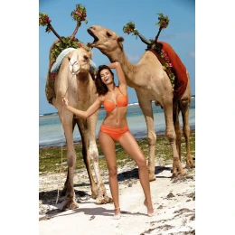Podprsenka typu bandeau má vystužené košíčky (bez push-up efektu) a košíčky s kosticami, ktoré tvarujú dekolt a udržiavajú prsia v správnej polohe. Ramienko za krk je odnímateľné. Plavky majú elastický pás so zaväzovaním na chrbte. Spodný diel je veľmi pohodlný a vpredu ho zdobí opasok s drahokamami. Plavky sú vyrobené z kvalitnej talianskej tkaniny, vďaka ktorej sú veľmi elegantné. Vyberte si ich a určite budete mať úspešnú dovolenku! Zloženie: 80 % polyamid, 20 % elastan.