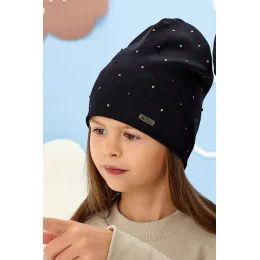 Dievčenská čiapka vyrobená z mäkkej bavlnenej základnej vrstvy. Zdobená korálkami a jemnou flitrovou aplikáciou.