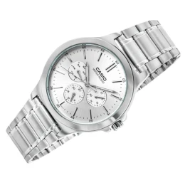 Casio MTP-VD300-7BUDF to zegarek męski o ponadczasowym charakterze, który wyróżnia się elegancką białą tarczą z trzema funkcjonalnymi subtarczami – wskazaniem dnia tygodnia, datownikiem oraz 24-godzinnym czasem. Wytrzymała stalowa koperta w połączeniu z bransoletą tworzą, stylowy zestaw, który sprawdzi się zarówno w codziennym użytkowaniu, jak i w bardziej formalnych okazjach. Mineralne szkiełko zapewnia ochronę przed zarysowaniami, a precyzyjny mechanizm kwarcowy gwarantuje niezawodne działanie. Zegarek posiada standardową odporność na wodę WR, co oznacza, że poradzi sobie z przypadkowymi zachlapaniami. To idealne połączenie prostoty, klasy i praktycznych rozwiązań w przystępnej formie.
