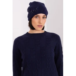 Teplá dámska zimná čiapka z hladkého úpletu s ozdobnou aplikáciou na boku.