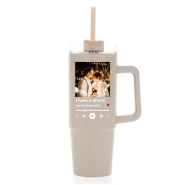 Cestovní termoska s průhledným víčkem s vlastním odkazem na oblíbenou písničku