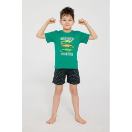 Chlapčenské pyžamo CROCODILES je ideálnou voľbou pre aktívnych chlapcov na letné noci, je vyrobené zo 100 % kvalitnej, mäkkej a priedušnej bavlny pre maximálne pohodlie pri spánku a voľnosť pohybu. Tričko s krátkym rukávom zdobí na prednej strane farebná športová potlač, ktorá celému kúsku dodáva energický a moderný charakter.