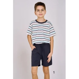 Klasické chlapčenské pyžamo s krátkym rukávom z bavlny, pruhované tričko, okrúhly výstrih.doplnené sú pevnými krátkymi šortkami s vreckami a nastaviteľnou šnúrkou.