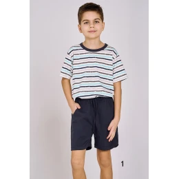 Klasické chlapčenské pyžamo s krátkymi rukávmi, vyrobené z bavlny, pruhované tričko, okrúhly výstrih. Doplnené pevnými krátkymi šortkami s vreckami a šnúrkou na stiahnutie na úpravu.