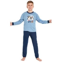 Chlapčenské pyžamo 477/136 Goal Cornette - vyrobené z kvalitnej a mäkkej bavlny - tričko je svetlomodré s dlhými rukávmi - zdobené farebnou potlačou - dlhé jednofarebné nohavice majú pohodlný elastický pás Zloženie materiálu: 100 % bavlna