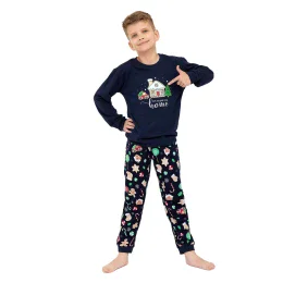 Chlapčenské pyžamo 966/157 Home CORNETTE - vyrobené z kvalitnej bavlny - tmavomodré tričko s dlhým rukávom - zdobené potlačou na prednej strane - dlhé vzorované nohavice - vianočná kolekcia