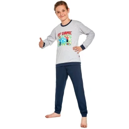 Chlapčenské pyžamo 268/148 Game 2 CORNETTE - vyrobené z kvalitnej a mäkkej bavlny - tričko je sivé s dlhými rukávmi - zdobené farebnou potlačou - dlhé jednofarebné nohavice majú pohodlný elastický pás Zloženie materiálu: 100% bavlna