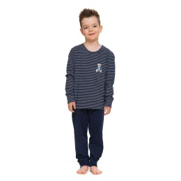Chlapčenské pyžamo 5256 Doctornap - tmavo modrá farba - vyrobené z veľmi kvalitnej a príjemnej bavlny - pruhované tričko s dlhými rukávmi - na prednej strane ozdobené potlačou - dlhé tamté nohavice - certifikát OEKO-TEX Standard 100