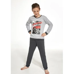 Chlapčenské bavlnené pyžamo značky Cornette. Pyžamo má tričko s dlhým rukávom a obrázkom na prednej strane. Spodná časť je dlhá a jednofarebná. V páse je mäkká, široká guma. Rukávy a nohavice sú zakončené jemným úpletom