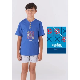 Dětské pyžamo italské značky Karelpiu. Pyžamo se skládá ze dvou dílů. Tričko má krátký rukáv, výstřih okolo krku je kulatý a má légu se třemi knoflíky. Na přední straně je natištěná aplikace. Kraťásky jsou v pase do pohodlné pružné gumy. Pyžamo je ušité z příjemné lehké bavlny ideální na letní dny. Pyžamo je ve dvou barevných variantách.