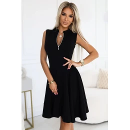 Blúzkové šaty Numoco so zipsom vpredu v elegantnej čiernej farbe. Vyrobené z elastického hrubšieho úpletu, ktorý poskytuje pohodlie a dokonale sa prispôsobí postave. Poľský výrobok, ideálny na rôzne príležitosti.