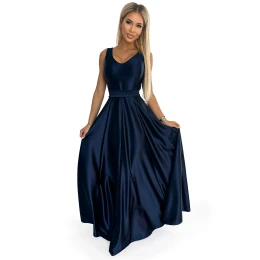 Tmavě modré dlouhé dámské saténové šaty s výstřihem a mašlí model 18976355 - numoco