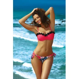 Propozycja dla pań, które marzą o dużych, jędrnych, seksownych piersiach, pięknie zebranych w dekolcie. Biustonosz wyróżnia się wspaniałą konstrukcją, przewidzianą na mniejsze i średnie piersi - jest usztywniany i posiada dość duże wypełnienie push up, umieszczone na stałe w biustonoszu. Umożliwia spektakularne wypchnięcie piersi ku górze, ich wymodelowanie i optyczne powiększenie, co zresztą widać na zdjęciu. Zastosowanie kwiecistej, delikatnej lamówki u góry, dodatkowo zwraca uwagę na pięknie wymodelowany dekolt. Ramiączka o regulowanej długości, odpinane, idealne sprawdzą się podczas opalania. Obwód wiązany na plecach. Figi to wzorzyste, wiązane po bokach brazyliany. Dla uzyskania pełnego efektu należy je mocno pociągnąć ku górze, aby ich trójkątny kształt ładnie ozdobił pupę, która częściowo wysuwa się poza kontur fig.