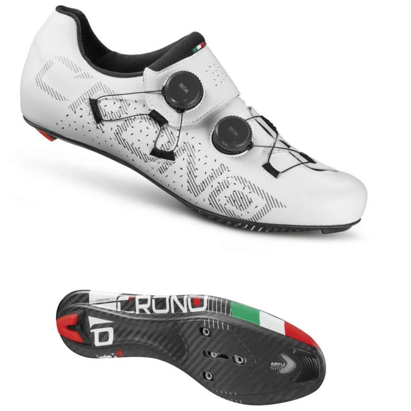 Crono CR1 je superľahká cyklistická obuv s podrážkou z uhlíkových vlákien, ktorá spája výkon s mimoriadne vysokým komfortom. 6-vrstvová podrážka z uhlíkových vlákien zabezpečuje prenos každého wattu energie do pedálov. Vďaka premysleným detailom, ako je protišmyková podšívka a laserom navrhnuté bočné vetracie otvory v kombinácii s exkluzívnym zapínaním, je CR1 naším špičkovým produktom. Spoľahlivý systém zapínania Multi Contact Closure System, vyvinutý v oddelení výskumu a vývoja spoločnosti CRONO, umožňuje neuveriteľne obopínajúce zapínanie, ktoré rozkladá tlak na 8 bodov, čím sa eliminuje zhrubnutie vytvorené vnútorným jazykom. Dva BOA® Li2 s potiahnutým oceľovým lankom umožňujú priamy kontakt s topánkou. Systém zapínania BOA® ponúka vysoký komfort nastavenia a rýchle prispôsobenie.