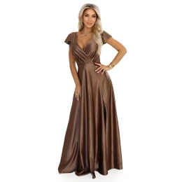 Elegantní saténové maxi šaty značky Numoco v barvě Mocha Mousse s obálkovým výstřihem, krátkými rukávy a rozparkem na nohou, který zvýrazňuje ženskou siluetu. jsou vyrobeny z lesklého saténu a krásně splývají . polský výrobek.