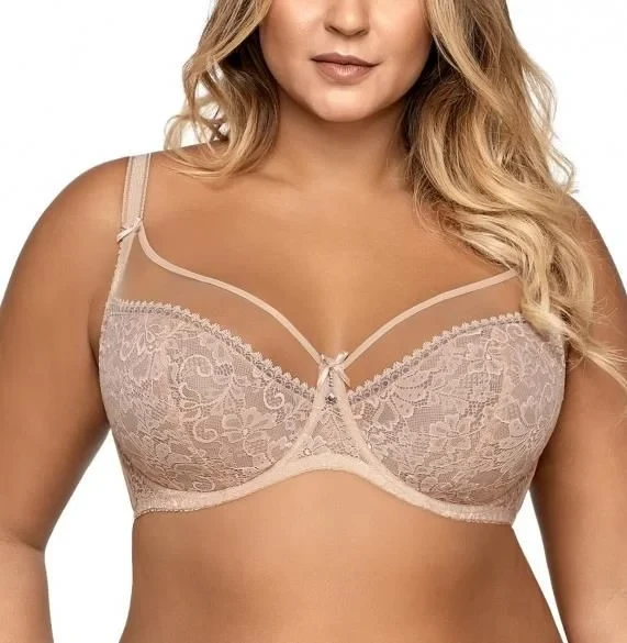 Elegantní podprsenka s měkkými kosticemi, ideální pro velká a středně velká prsa. Model je téměř celý vyroben z krásné krajky, která je ve výstřihu kombinována se síťovaným tylem. Konstrukce velmi dobře shromažďuje a tvaruje prsa a zároveň dobře drží jejich hmotnost. Střed zdobí luxusně lesklá visačka. Složení: 88 % polyamid, 8 % bavlna, 4 % elastan.
