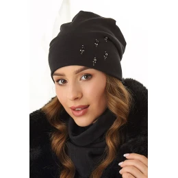 Dámský klobouk z podkladu z hřejivé bavlny, zdobený korálky. Přechodný model, ideální pro lidi, kteří nemají rádi tlusté klobouky.