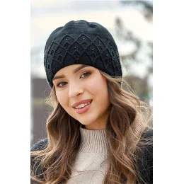 Klasický klobúk so zaujímavým vzorom a striebornými kamienkami. Teplý, ušitý z dvoch vrstiev úpletu, mäkký a príjemný na dotyk.