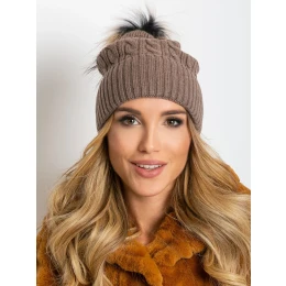Czapka z warkoczowym splotem i futrzanym pomponem ciemnobeżowa