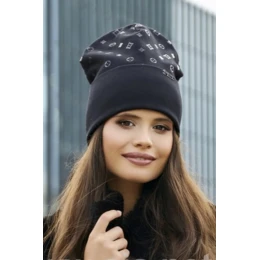 Dvojitá bavlnená čiapka, zložená, zdobená jemnou lesklou potlačou.
