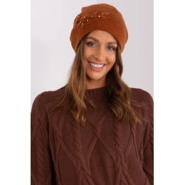 Teplá dámska zimná čiapka z hladkého úpletu s ozdobnou aplikáciou na boku.