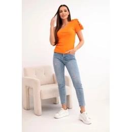 Tato dámská bavlněná top na jedno rameno s volánem je efektní model, který zdůrazňuje siluetu a dodává stylizaci výrazný, ženský charakter. Vyrobeno z elastického, ribbed úpletu se dokonale přizpůsobí tělu a zajišťuje pohodlí a komfort nošení po celý den.