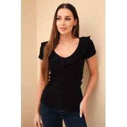 Stylová dámská blůza s ozdobnou volánkovou lemovkou u výstřihu, která jemně zdůrazňuje ženský charakter stylizace. Vyrobena z elastického, pruhovaného materiálu, dokonale se přizpůsobí siluetě a zajišťuje komfort nošení po celý den. Klasický střih dává blůze skvělou použitelnost jak na běžné dny, tak na elegantnější příležitosti.