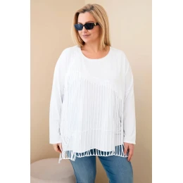 Hľadáte štýlovú blúzku, ktorá pritiahne pohľady a zabezpečí pohodlie pri nosení? Dámska blúzka s dlhými rukávmi s strapcami Plus Size je výnimočnou ponukou pre ženy, ktoré ocenia módny, nevšedný vzhľad. Originálne lemovanie strapcami dodáva ľahkosť a charakter a oversize strih sa dokonale prispôsobí postave a poskytuje voľnosť pohybu.
